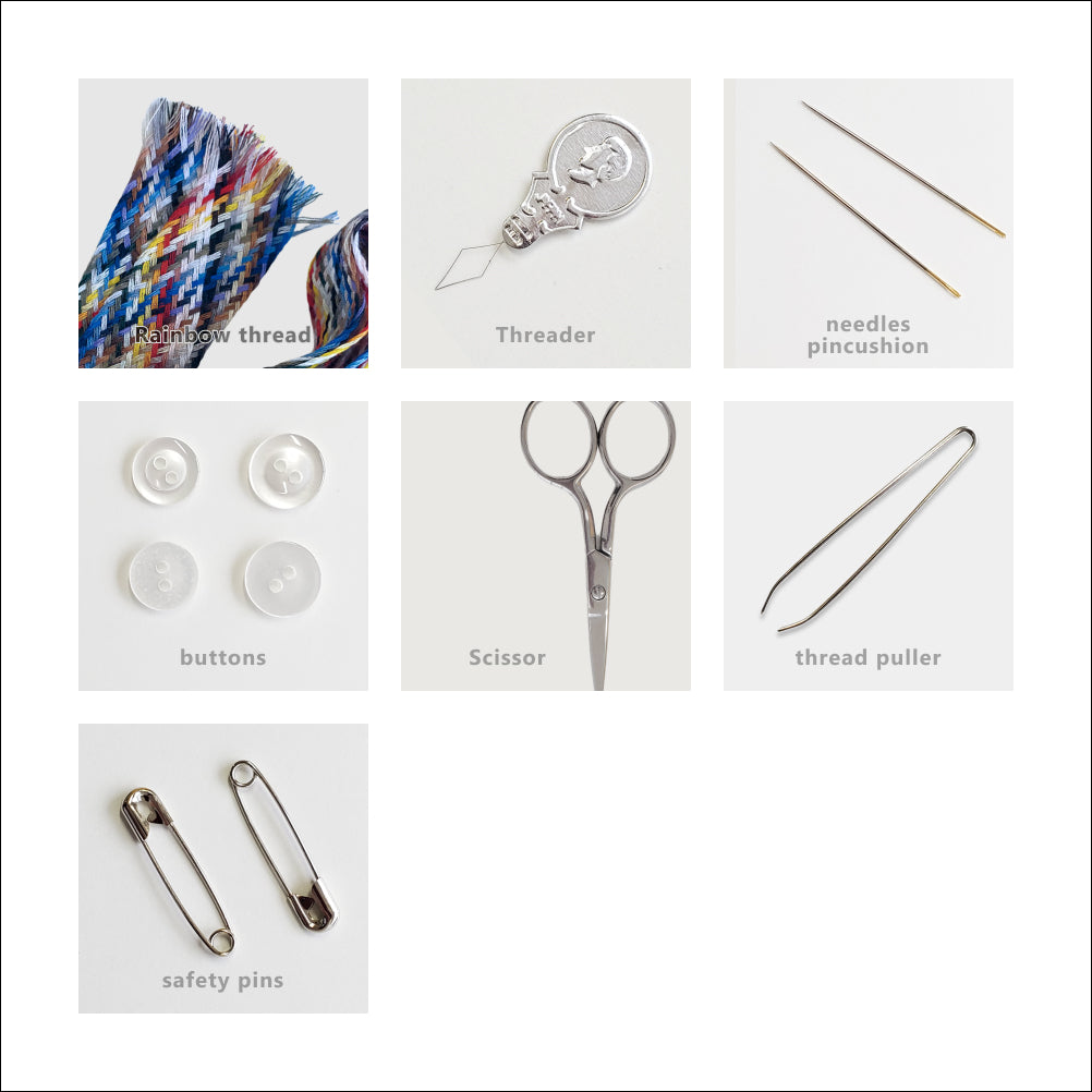 包括128根編織30色線/金屬剪刀/拔線鑷/穿針器/安全別針/針/2個紐扣