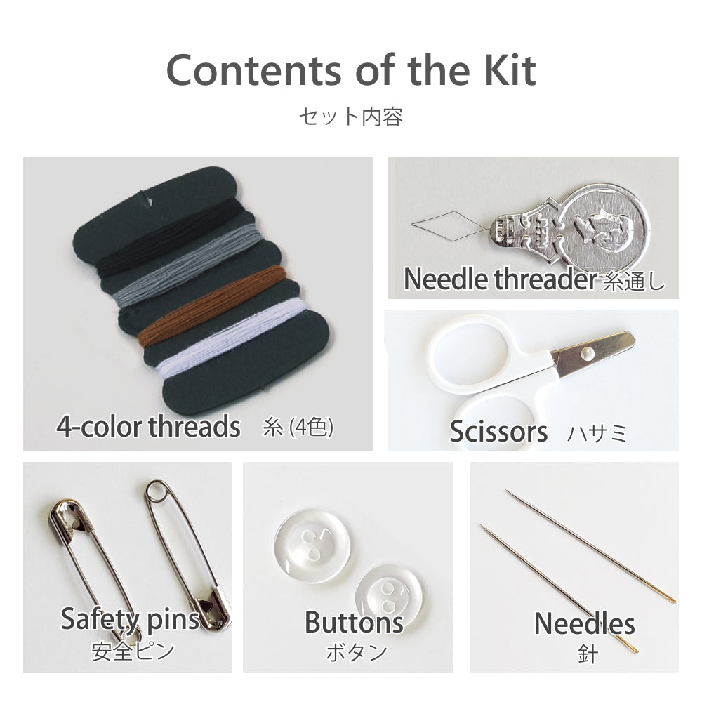 ●套件內容 - 通用手縫線(黑色、白色、棕色、灰色)/ 小彈簧剪刀 / 2根針 / 穿針器 / 安全別針 / 2個兩孔扣 / 雙面織物粘膠帶